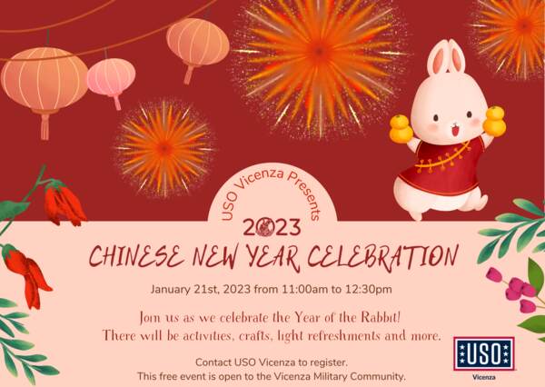 USO Vicenza is celebrating the year of the rabbit at our Chinese New Year’s Celebration. There will be fun crafts, activities and snacks to try, and all for free!