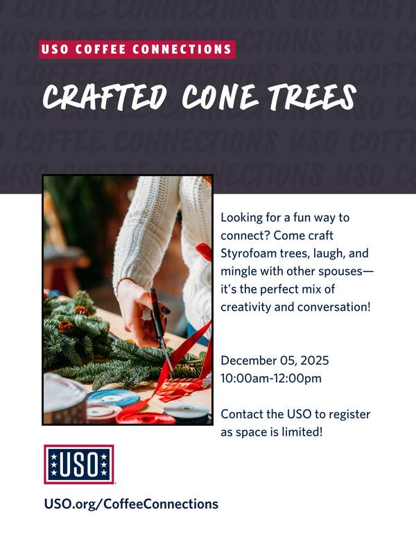 The USO Vicenza is hosting a crafting Coffee Connections with our talented volunteer helping the spouses create cute cone shaped holiday decorations. Please due to limited space we ask that children do not attend this event.