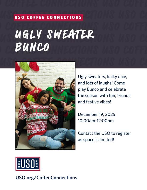 The USO Vicenza is conducting our annual Ugly Sweater Bunco event. Come in your ugliest or coolest holiday sweater and join in on the festivities. A special prize will be given to the ugliest or most unique holiday sweater.